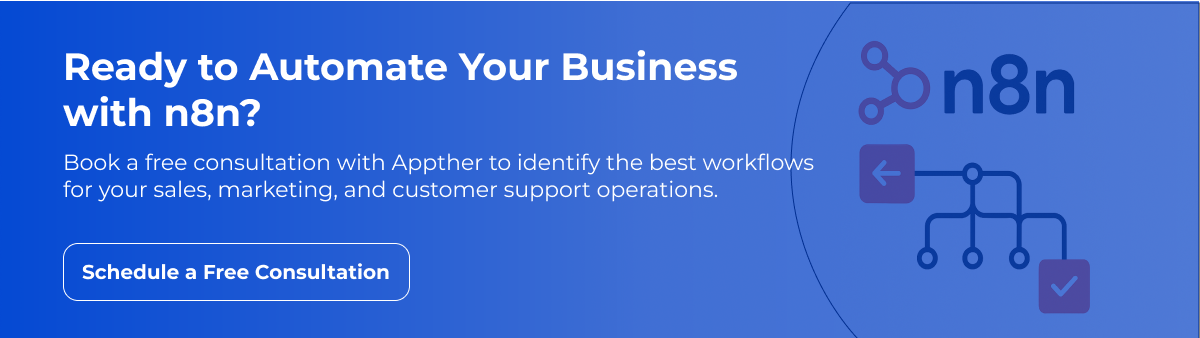 With the right partner like Appther, automation isn’t just technical — it’s strategic. You implement not just workflows, but a growth roadmap powered by n8n.